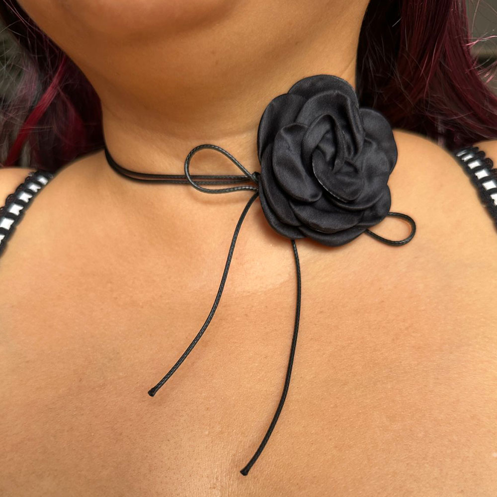 Collar bohemio y elegante con una rosa negra central elaborada en fibra sintética de poliéster. Su diseño largo y ajustable en capas ofrece un estilo sofisticado y moderno, ideal para complementar atuendos tanto casuales como formales. La collarina de felpa aporta un acabado suave y delicado, convirtiéndolo en una pieza llamativa y versátil para mujeres que buscan un accesorio con carácter.