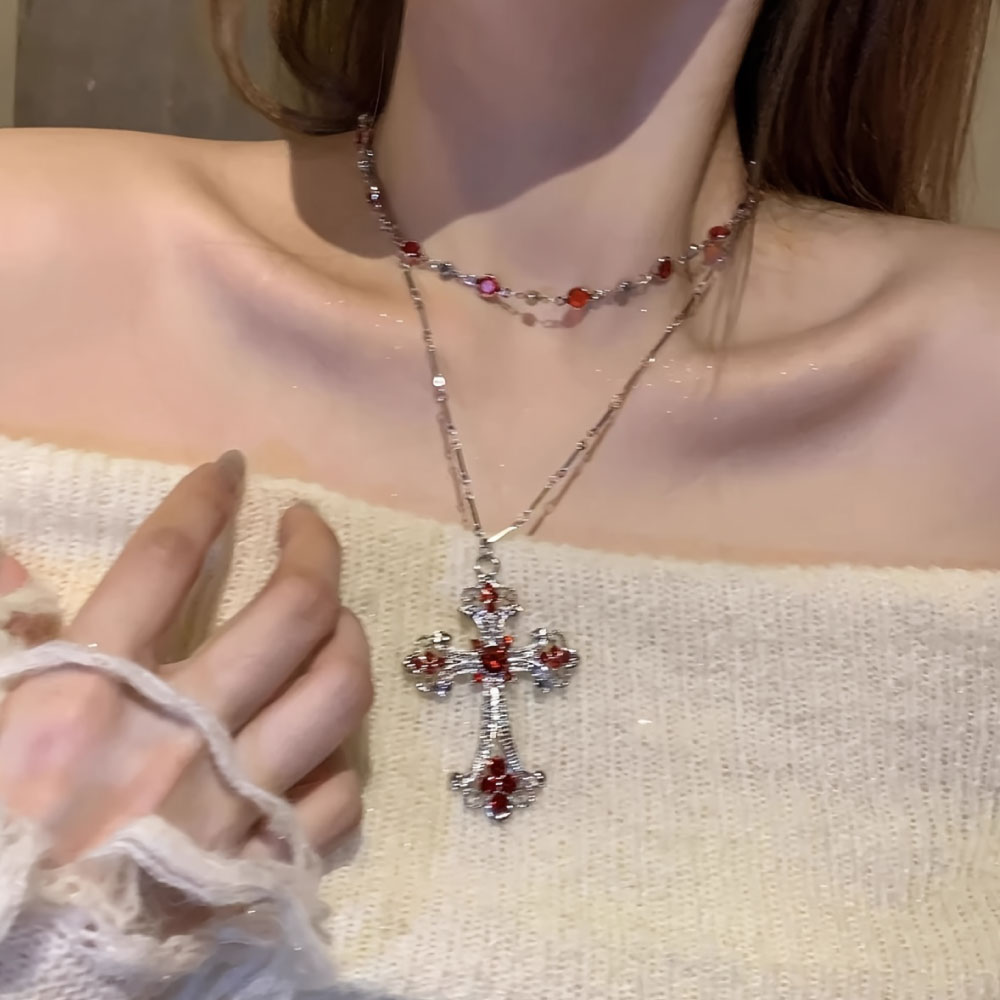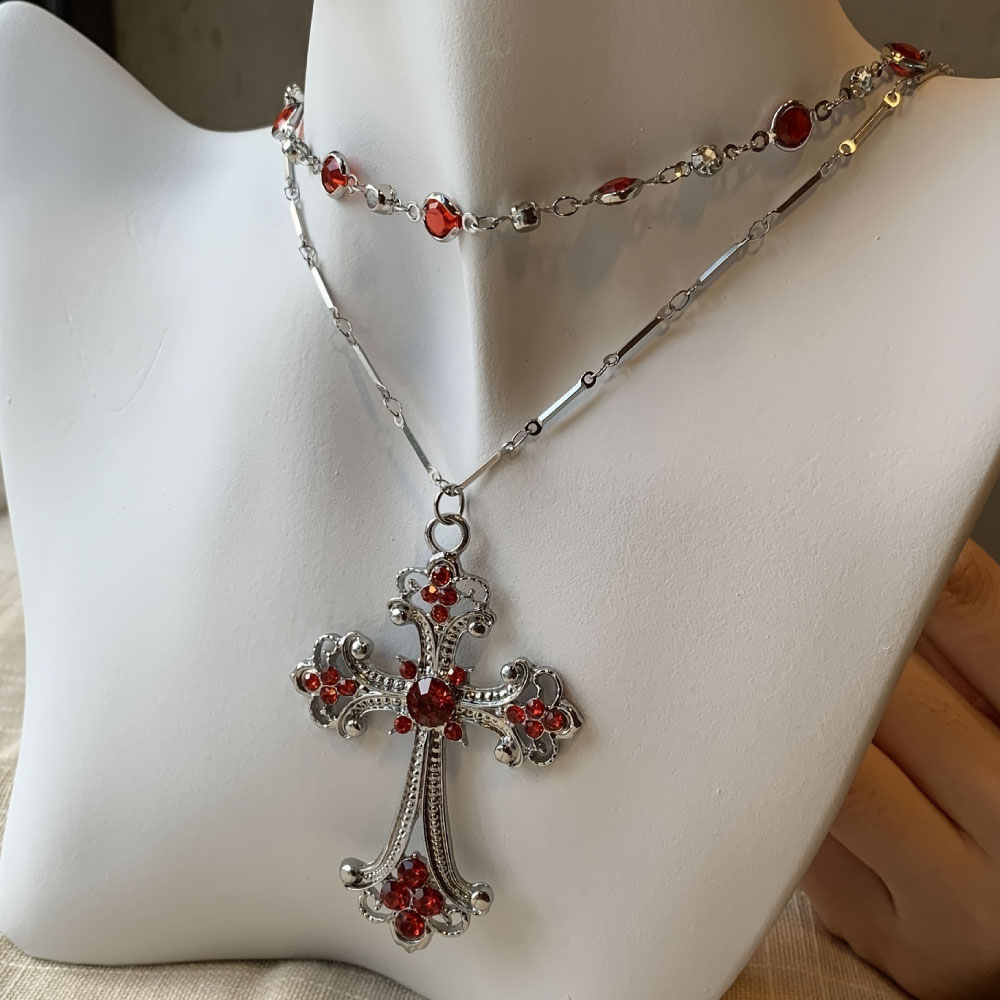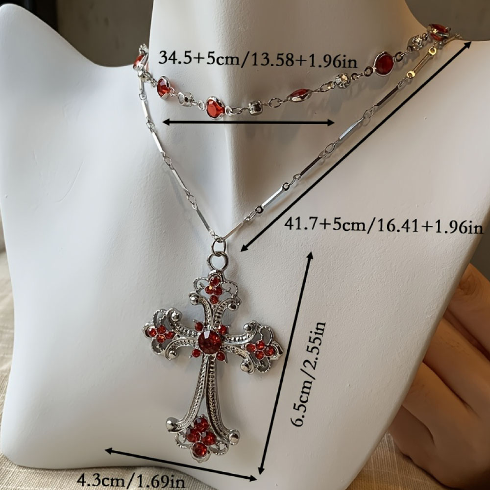 Doble collar gótico con cruz, un símbolo de estilo audaz en plata y rojo. Combina la esencia retro con una actitud moderna para crear looks únicos y llenos de carácter. La pieza definitiva para destacar tu moda femenina alternativa.