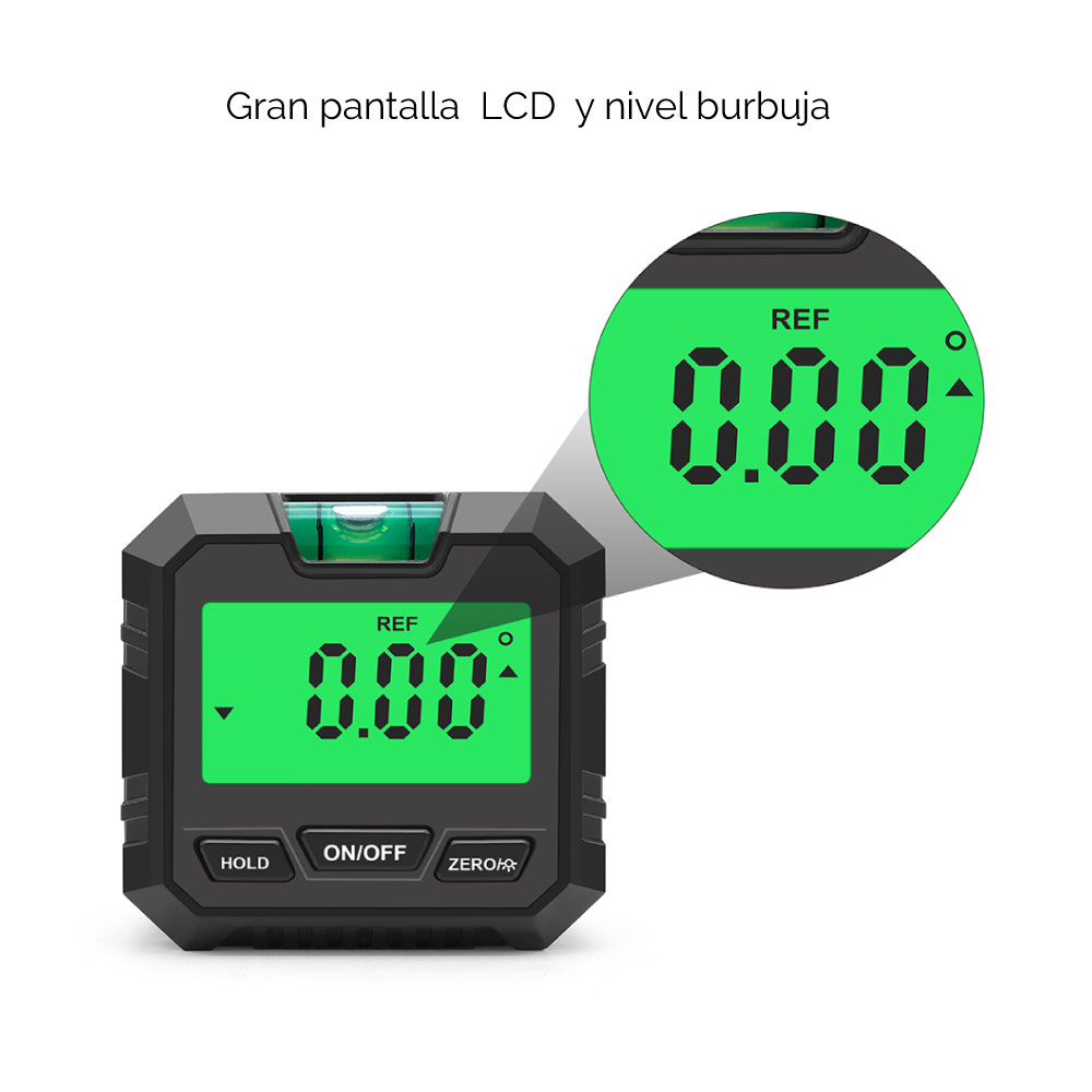Nivel analógico: Además de la medición digital, cuenta con un nivel de burbuja horizontal para mayor versatilidad.